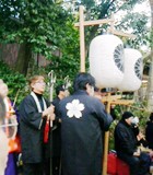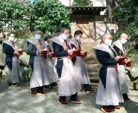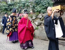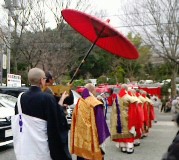 深大寺に戻ると、すでにお練り行列がスタンバイしていて、カメラを構えた人々も脇に並んでいる。講中の人々が小さい食膳のようなものを捧げ持っているのは「百味献膳」の儀式によるものだそうだ。雅楽衆を先頭に正装の僧侶たち・裃姿の講中・木遣り衆が続く。
