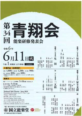 ワキは人数が少ないせいなのか、これまでの青翔会や若手能でも、ワキだけはベテランということも多いが、今回「杜若」のワキは1998年生まれの渡部葵さんで、若々しい旅僧だったのが良かった。渡部葵さんは前回の青翔会で「脇語り七騎落」を語っていた。