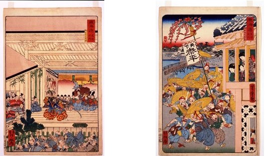 資料館では40周年記念収蔵展をやっていたが、その中に「東海道名所之内 御能拝見」があった。文久三年に描かれた浮世絵で、「朝番」は河鍋暁斎・歌川芳虎・歌川広重、「昼番」は河鍋暁斎・歌川芳虎。また明治22年の「町人御能拝見之図」橋本周延も。