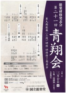 昨年秋に、勉強会の当番と重なっていることをすっかり忘れて青翔会のチケットを購入 、大慌てでウォーク仲間のお一人に無理を言って行ってもらったことを忘れ、3月の青翔会も当番を入れてしまった!!しかし春は若手能もあるのでまぁいいか・・・3月は宝生の別会能も気になってたし