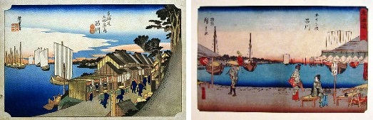 左はよく見かける保永堂版「品川日之出」ですが、右は隷書版「品川鮫洲の茶屋」です。保永堂版が東海道を行く参勤交代の大名行列を描いているのに対し、隷書版の茶屋で休む女たちは、旅人ではなく品川の海を見物する江戸の母娘らしい。左の男性は大山詣帰りで、担いでいる赤い房のようなものが付いた棒は「梅酢槍」という大山土産であると、人文社の画集解説に書いてあるのですが、梅酢槍って何なのか、検索してもわかりません(汗)。
